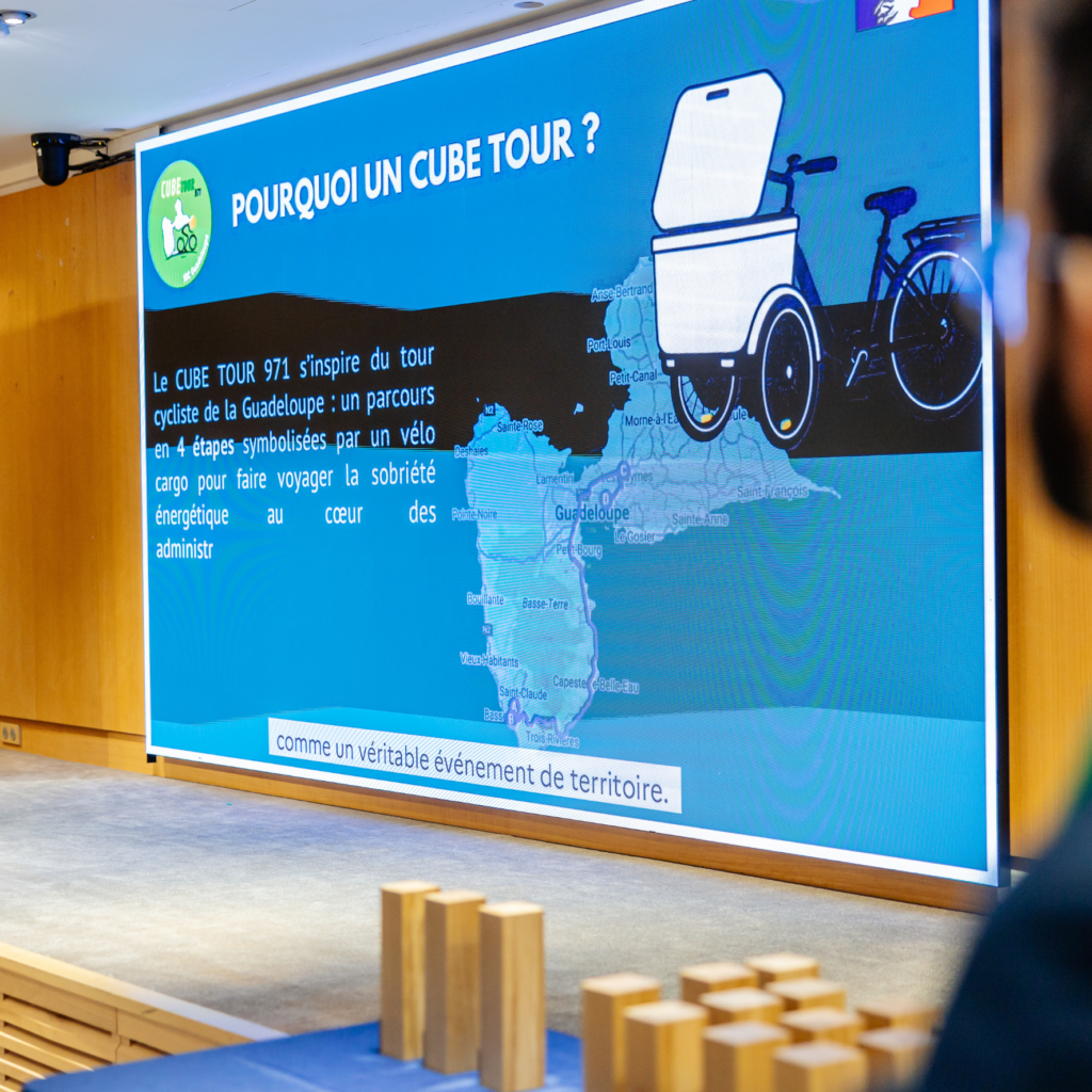 Ce trophée a été remis à la DEAL de Guadeloupe pour son événement « CUBE Tour 971 ». Son ambition ? Faire vivre la démarche CUBE au plus près du terrain en allant directement à la rencontre des agents. A travers un parcours en vélo-cargo de 4 étapes à travers l’île, les équipes ont sensibilisé les occupants des bâtiments engagés au concours aux enjeux de sobriété énergétique et aux écogestes du quotidien.